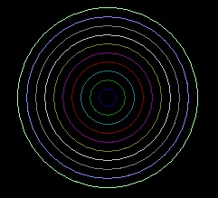مثال 7: برنامه ای بنویسید که مختصات مرکز دایره را از ورودی گرفته و 10 دایره ی متحد المرکز رنگارنگ بکشد: